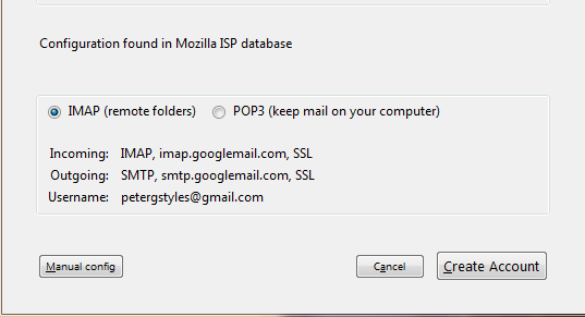 5. Once the configuration has been found, you are good to go. Simply click ‘Create Account‘ and Thunderbird will start downloading your mail.